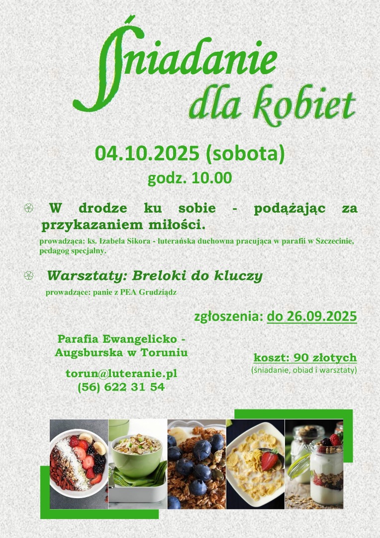 Parafia Ewangelicko-Augsburska w Toruniu oraz Diecezja Pomorsko-Wielkopolska zapraszają na Śniadanie dla Kobiet, które odbędzie się w sobotę 4 października br. w Toruniu.