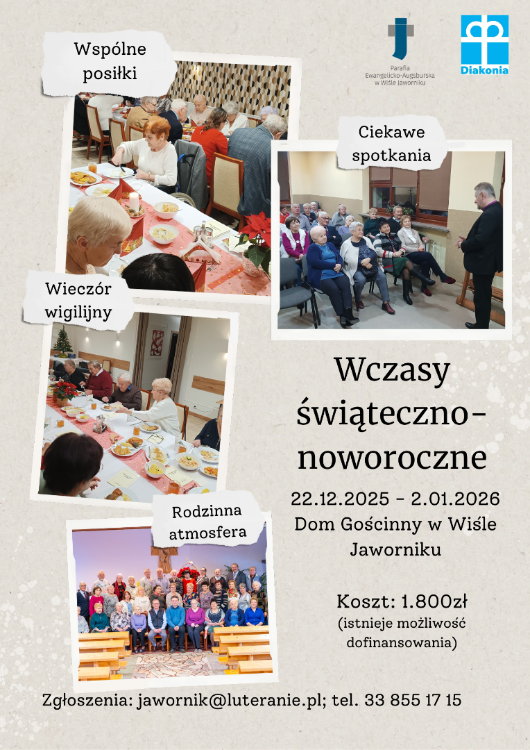 Parafia Ewangelicko – Augsburska w Wiśle – Jaworniku oraz Diakonia Kościoła organizują po raz kolejny Wczasy świąteczno-noworoczne dla osób starszych i samotnych. Prosimy o przekazanie tej informacji osobom starszym, samotnym i zachęcenie do wzięcia udziału.